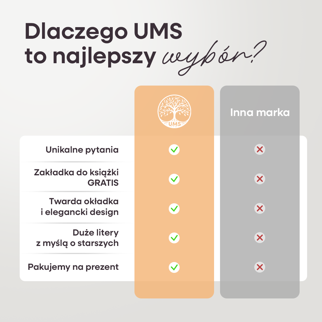 Jest to książka, w której znajduje się ponad 150 stron, a na nich pytania do Twojej mamy. O jej dzieciństwo, wspomnienia ze szkoły, pierwsze złamane serce i wiele więcej. Mama uzupełnia odpowiedzi lub odpowiada Tobie na pytania, a Ty zapisujesz. Dzięki temu będziesz mieć bezcenną pamiątkę po mamie, nawet jak jej zabraknie.